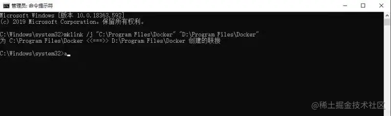 先在D盘建立Docker文件夹,我这里位于D:\Program Files\目录下,使用管理员命令创建软连接: