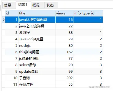 现在我要查询info表所有的数据,很容易写出如下sql