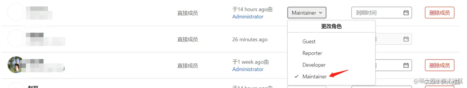 点击成员后,会打开一个成员列表页,项目成员中有一列。专门展示对应操作权限,即如下截图中的最大角色列。把对应的操作权限加上即可。