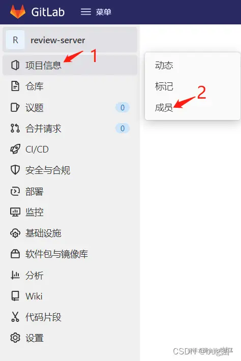 找到在gitlab的对应项目,然后找到项目信息,鼠标悬浮项目信息会展示一个右侧菜单,我们点击成员。