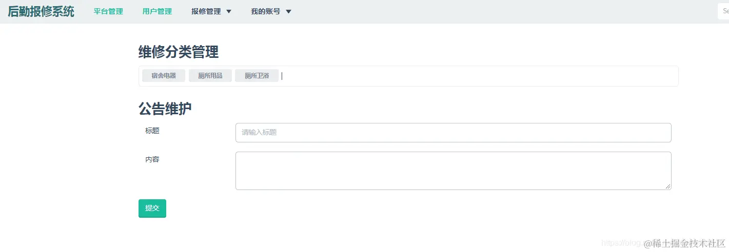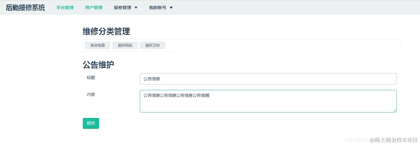 - 管理员角色:admin / 123456 主要可以管理用户信息,报修分配维修人员,发布公告,维修类型管理,个人资料修改等功能