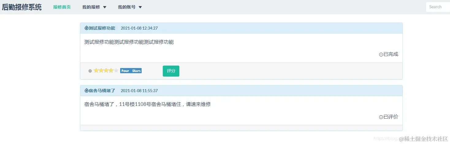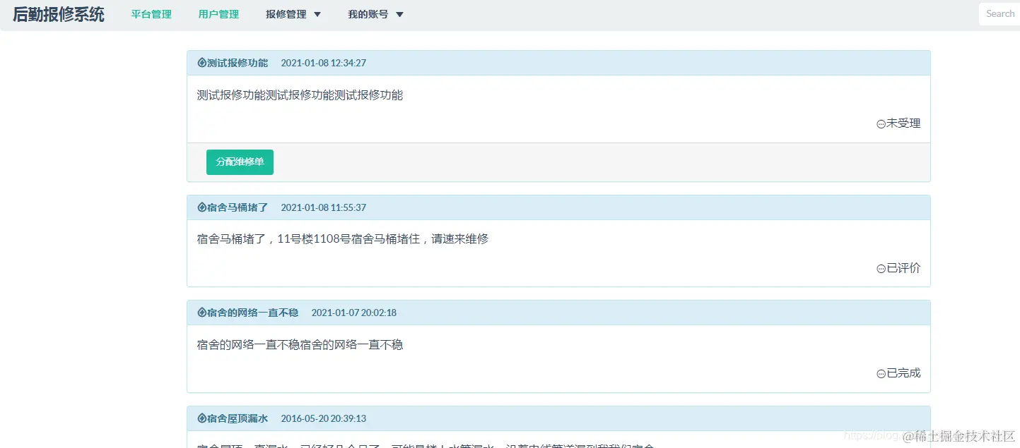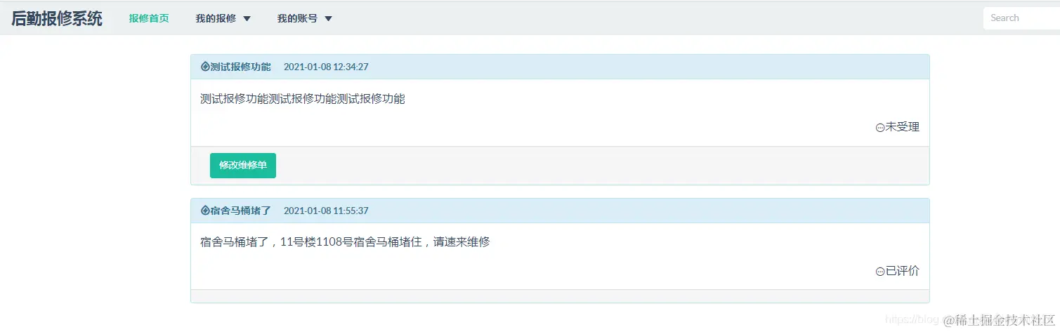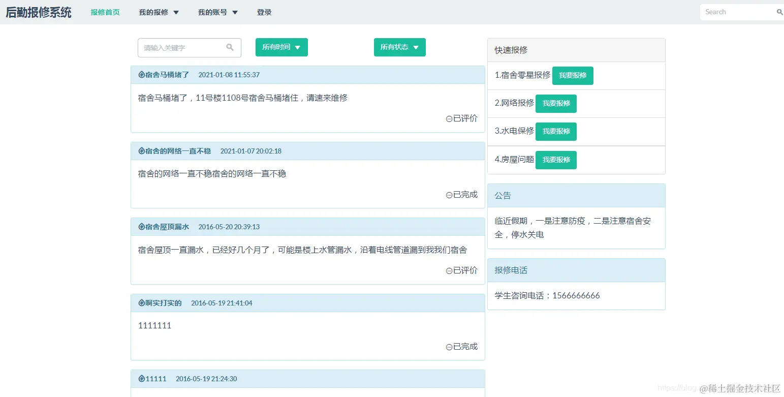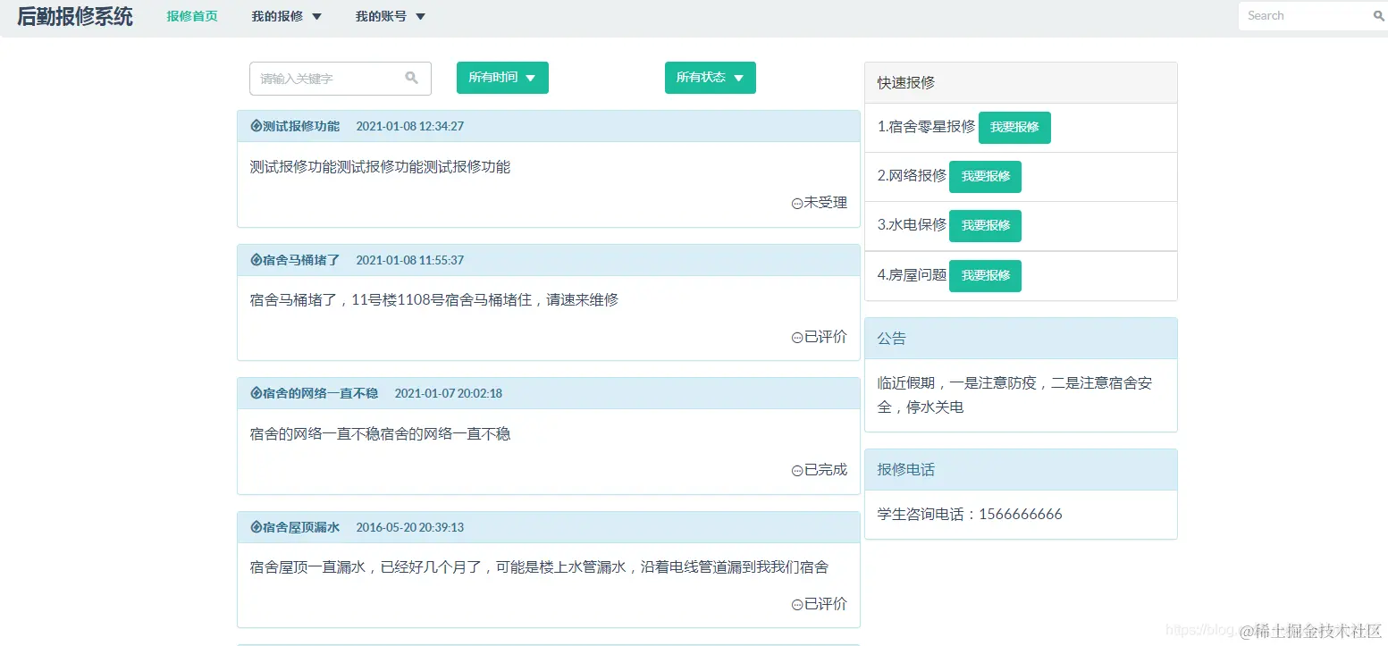 - 报修系统首页:可以根据时间和状态进行搜索报修记录