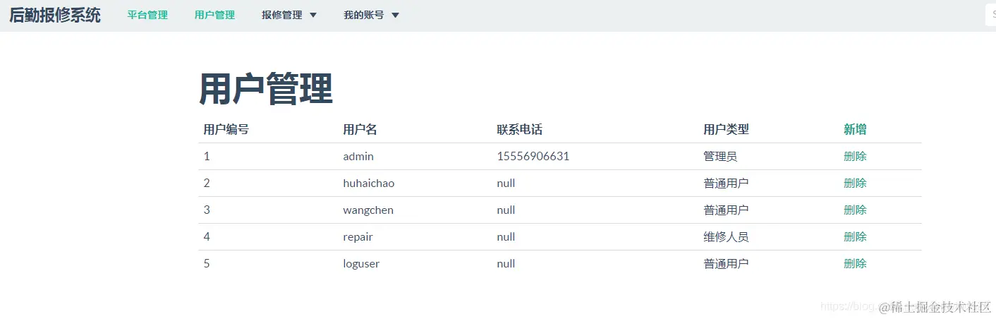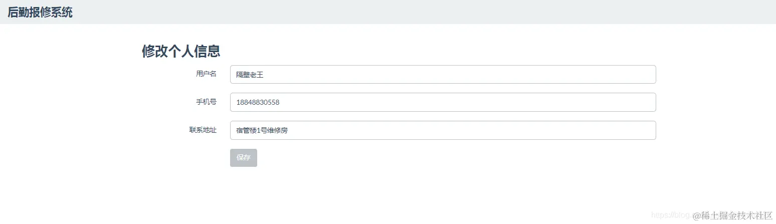 - 普通用户:loguser / 123456 主要可以进行宿舍问题报修,查询报修记录,对报修结果进行评价,查看公告,修改个人资料等功能