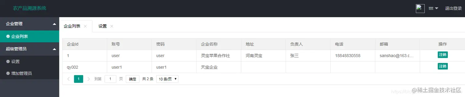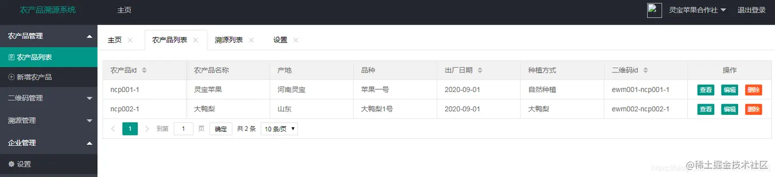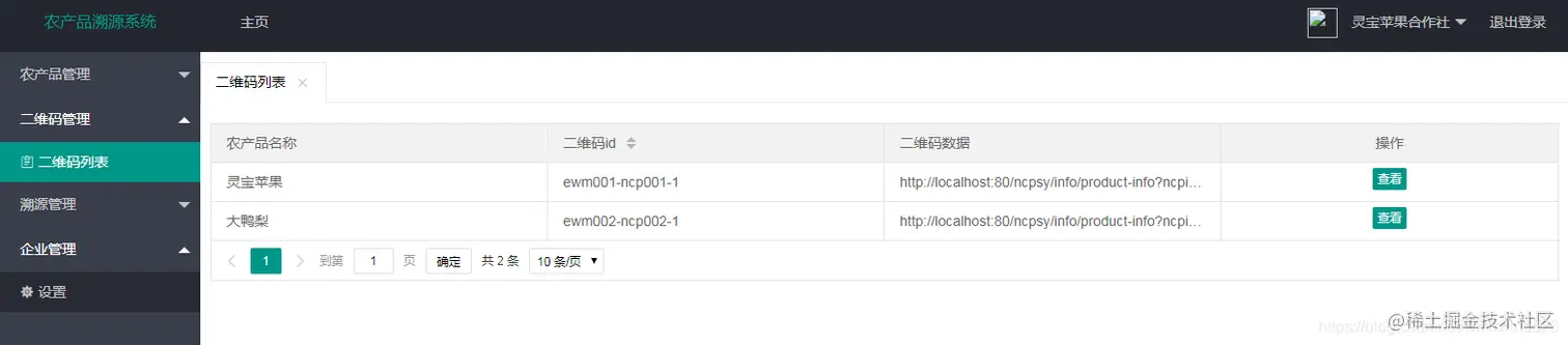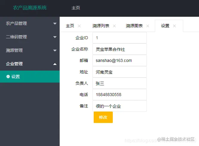 本系统主要定位于农产品的信息溯源工作,可以根据农产品的相关信息生成二维码,然后将二维码贴到我们的农产品包装上,购买产品的顾客可以通过手机扫描二维码获得产品的相关信息,从而实现产品的溯源。在系统的前端页面,也提供了供用户查询农产品信息的入口搜索。本系统基于SSM框架技术实现,数据库采用mysql,开发工具为IDEA。农产品溯源管理平台后台管理主要分为两个角色进入系统进行管理:一个是管理员账户,一个是企业账户。管理员账户可以添加企业,管理用户。企业用户登陆系统可以添加产品,根据产品生成二维码,并可以进行产品的信息统计操作。
