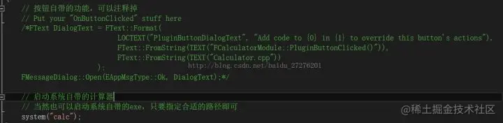 这时候重启编辑器(大多数时候需要)会发现 Toolbar 上多了一个按钮,这个按钮默认的执行操作是:点击时会弹出一个提示框,其内显示一些基本的测试信息。但是这并不是我们需要的功能。所以我们找到插件的源码,注释或删除原有的功能,添加上我们自己的功能。具体操作如图: