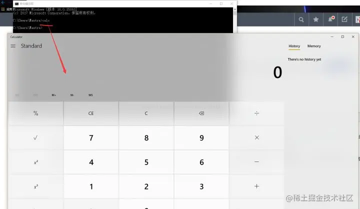 首先,我们要明确启动系统计算器的方法:对于大多数人来说,是通过快捷方式启动(无论是桌面,开始菜单还是任务栏,都属于这一类);但是对于程序员来说,这样显得太低级啦(哈哈哈),我们要用黑窗口,窗口,口。。。。。。。打开黑窗口,在里面输入 calc 即可启动计算器(同样还可以通过 mspaint 启动画图软件,类似的命令还有很多,读者可以自行搜索),如下图: