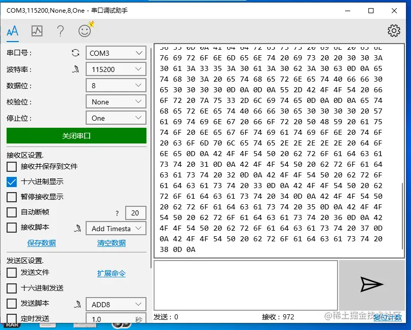 在微软商店下载串口调试助手,如果按reset键,能出现下面的结果,说明板子可以连上,如果输出是空白,则说明板子连不上,可能是板子的tf卡是坏的。)