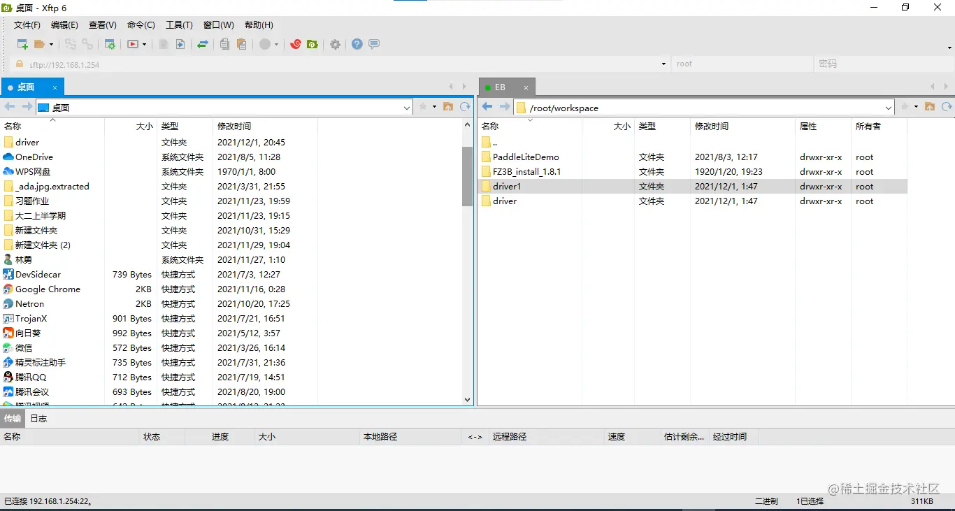 这时候就需要用到xftp了(xftp可以在我上传到文件的压缩包Xshell6_Plus破解版.zip中找到)。可以通过双击左半部分界面里的文件,把本地文件传输到板子里,你点的是哪个路径下,就会传到相应路径下。如果你的文件需要修改,也可以通过相同的方式把板子里的文件传输到本地。注意路径,不然会忘记文件传输到哪里了,就不太好找了。文件修改操作在板子里操不了,必须在本地完成。
