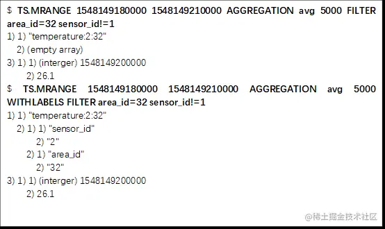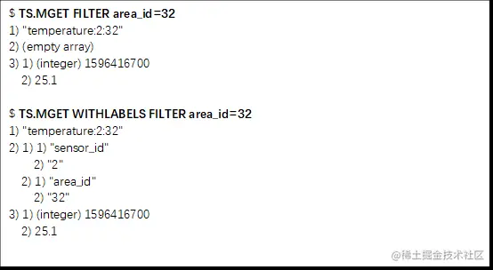 下列TS.MGET命令,以及FILTER设置(这个配置项用来于设置集合标签的过滤条件),查询area_id等于32的所有数据集合,并返回各自集合中最新一条数据。