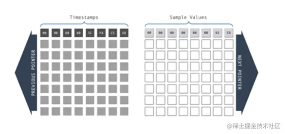 RedisTimeSeries将所有的时序数据存储在chunks中。每个chunks均由双向链表中的两个相关数组组成(一个用于时间戳,一个用于样本值)。每个chunks都有预定义的样本大小,当chunks填满的时候,其他数据将自动存储到下一个chunks。chunks size可以通过参数 CHUNK_SIZE进行设置。(CHUNK_SIZE的设置必须为8的倍数,默认值:4096)