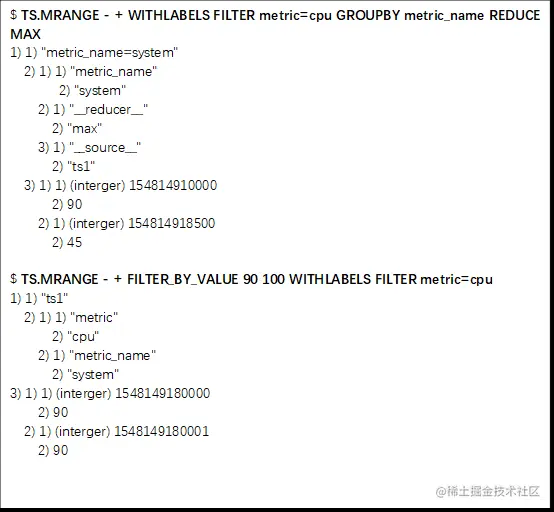 TS.MGET命令用于按标签查询集合中的最新数据。在使用TS.CREATE创建数据集合时,可以给集合设置标签属性。当进行查询时,就可以在查询条件中根据集合标签属性对数据样本进行匹配,其查询结果只返回满足匹配集合的最新数据。