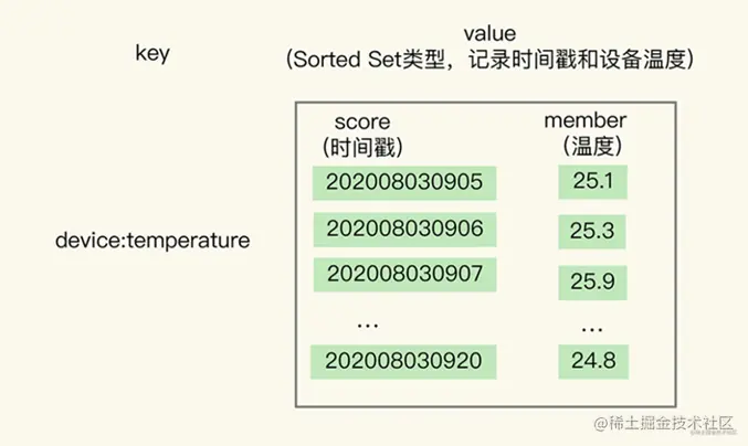 基于Sorted Set保存时间序列数据的特点是能够同时支持按时间戳范围的查询,能够根据元素的权重值来排序,在时序数据的情况下,将时间戳作为Sorted Set集合的权重值,后跟时间点上记录的测量数据,例如:<时间戳>:<测量值>。RedisSorte Set的内部使用Hash Map和SkipList来保证数据的存储有序,使用SkipList的结构可以保证具有较高的查询效率,并且在实现上比较简单。