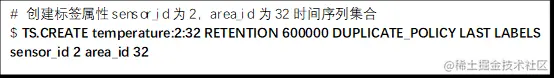 TS.CREATE命令用于创建时间序列数据集合,使用时需要设置时间序列数据集合的key和数据过期时间(以毫秒为单位)。还可以为数据集合设置标签,来表示数据集合的属性。说明: