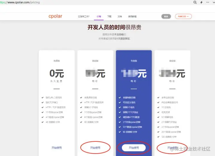 在这里,我们选择合适自己的套餐(如果仅用于网站网页,可以选择基础版套餐;但如果有远程操作其他设备等tcp需求的,则需要专业版及以上)。直接点击对应套餐下方的“开始使用”