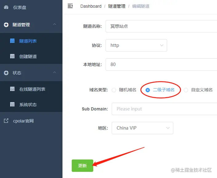 在填写相关信息,并付费后,就能在cpolar中选择“固定二级子域名”服务。接着,我们回到cpolar客户端,进入“隧道列表”项。找到我们的“冥想站点”隧道,点击“编辑”按钮。