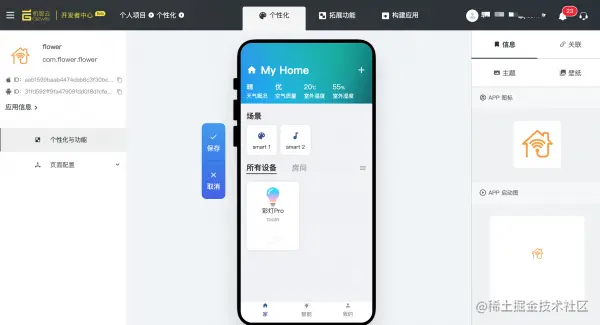 更方便的在线APP开发方式是使用机智云新版开发平台(需提前定义数据点),在线自定义APP的功能页面、展示信息,自己替换logo、根据模板来修改图标位置大小等,开发出自己的APP。