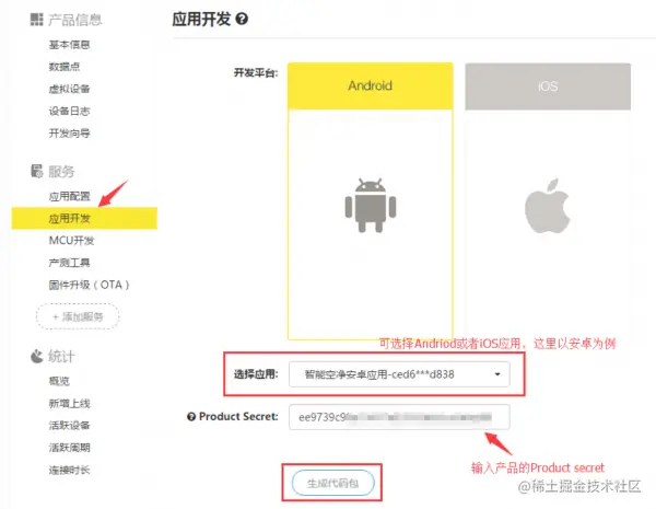 在线生成APP源代码的模式以“机智云”为代表,当你的项目设置完成后(定义数据点是关键),可以在线生成代码包,然后下载之后进行编译。