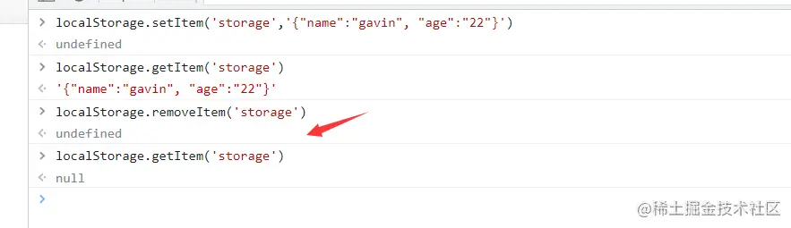 此时浏览器缓存中key值storage对应的信息已经删除,通过getItem已经获取不到了。