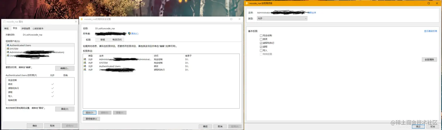 解决办法: 在私钥上右击选择属性,然后选择【安全】选项卡,然后点击下面的【高级】按钮,然后在新弹出的窗口下方点击【禁用继承】,然后点击继承那个按钮上面的【添加】按钮重新将当前 Windows 登录用户设置为私钥的所有者,并勾选所有权限。最后跟下面一样即可: