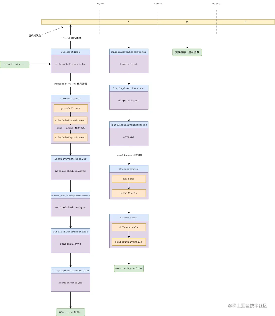 由于绘制是在收到 Vsync 信号才开始的,而请求绘制则可以在任意时间点(如手动调用 invalidate),所以本节将补充从请求绘制到绘制开始的这段时间节点里发生了什么。