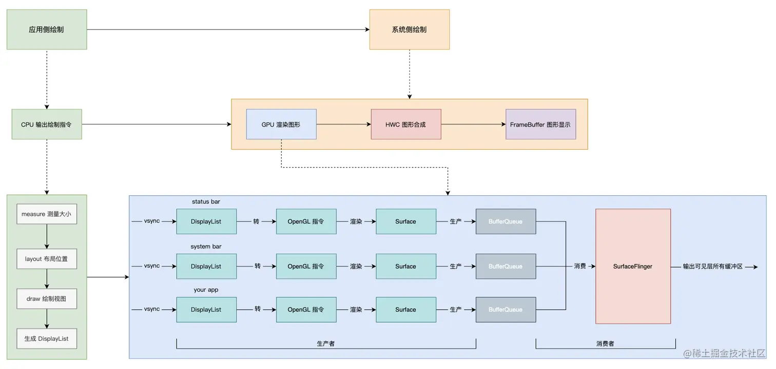 上图是 Android 将一个布局通过硬件渲染的方式显示到屏幕,这个过程可简化为俩步:应用侧绘制和系统侧绘制。