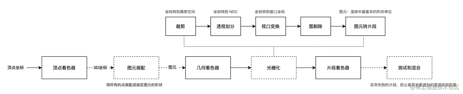 OpenGL 渲染管线的基本流程如下,其中,光栅化会把图元映射为最终屏幕上相应的像素,片段着色器即对要渲染的每个像素单元着色。