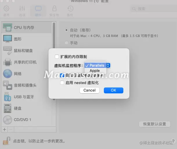 3.弹出的高级设置选项,把你的目光看向 【虚拟机监控程序:】,然后点击Parallels选项。