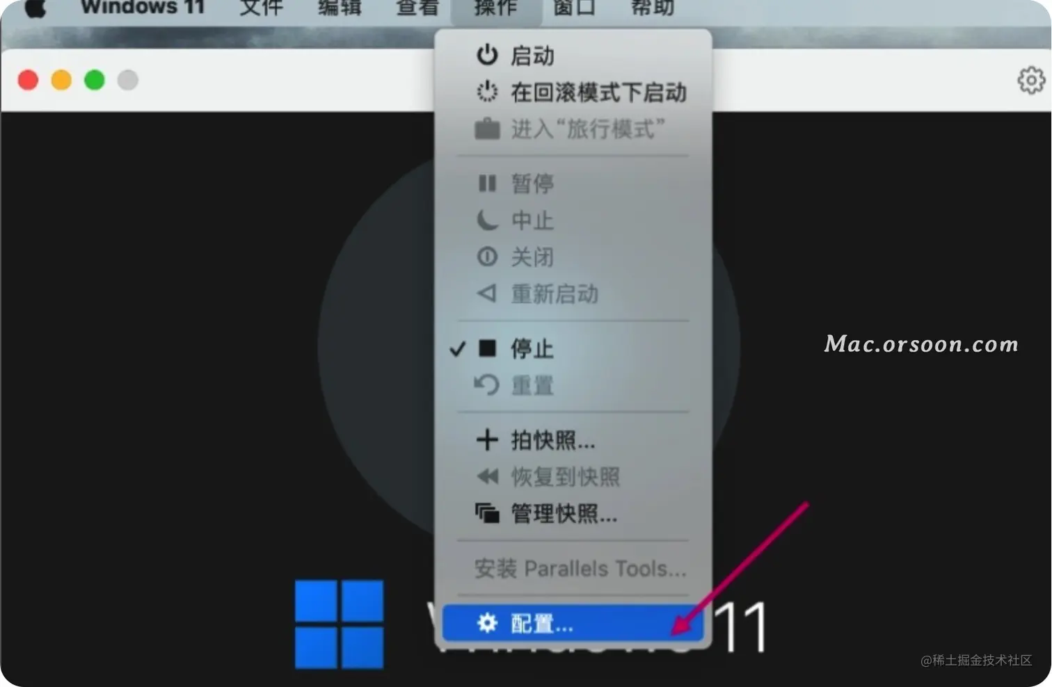 打开Parallels Desktop 虚拟机的状态,再Windows安装的界面先把把Windows虚拟机停止,然后再点击顶部的 【菜单】 按钮找到 【配置…】选项进去