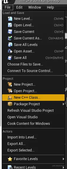 如果您的工程已经是 C++ 工程,可以略过此步。点击 File>New C++ Class ,随便选择一个父类创建即可。这样纯蓝图工程就能变为 C++ 工程。