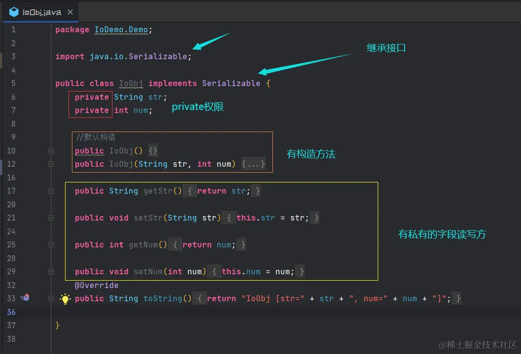 这就是一个满足序列化的类,这个类我定义了两个字段,最后一个重写是返回了一个String值,他就和普通类作用一样,只不过需要满足一些条件。