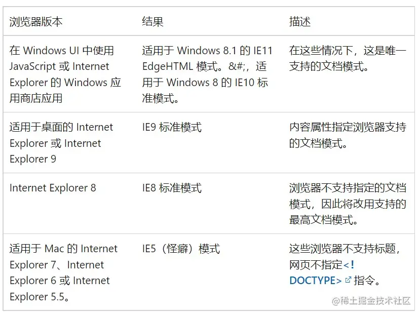 (在“指定浏览器模式或文档模式无效“中能较好理解上表)