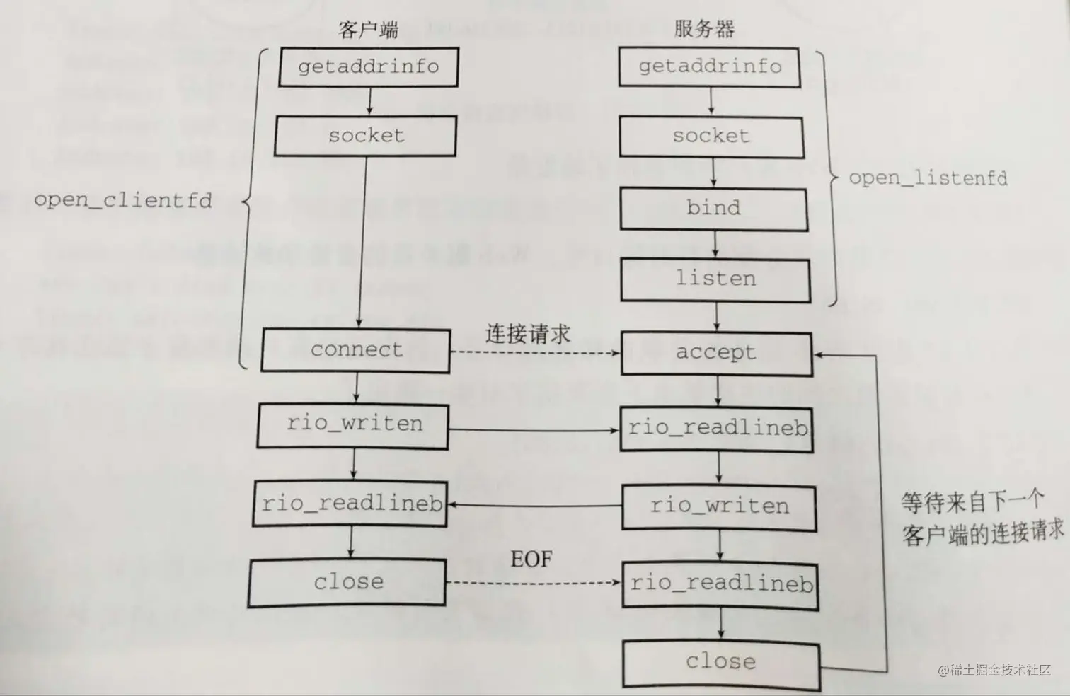 首先,调用getaddrinfo,返回一个addrinfo结构体链表。遍历该列表依次尝试列表中的每个条目中的ai_addr指向的套接字地址,直到调用socket和connect成功。如果一个失败,则在下一次尝试前关闭掉这个套接字描述符。如果成功建立连接,就释放列表内存,并把套接字描述符返回给客户端,客户端就可以利用它与所有Unix I/O函数与服务器通信了。
