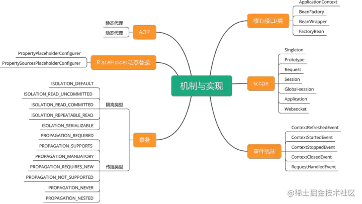 spring的事件机制需要知道spring定义的五种标准事件,具体事件可见上图,了解如何自定义事件和实现对应的applicationListener来处理自定义事件。