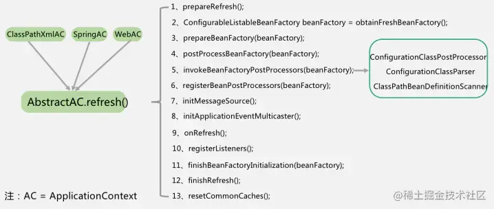 图中左上角是三种类型的context,xml配置方式的context、springboot的context和web服务的context。不论哪种context,创建后都会调用到AbstractApplicationContext类的refresh方法,这个方法是我们要重点分析的。