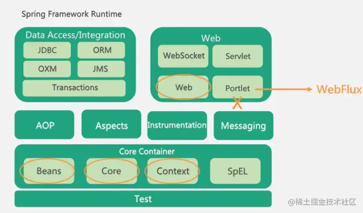 上图列出了spring框架主要包含的组件。这张图来自spring4.x的文档。目前最新的5.x版本中右面的portlet组件已经被废弃掉,同时增加了用于异步响应式处理的WebFlux组件。