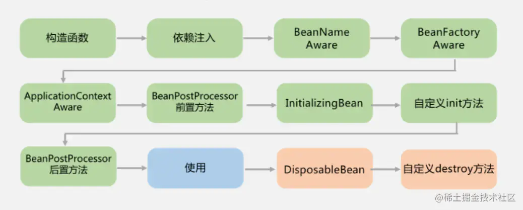 面试中经常问到的bean的生命周期,先看绿色的部分,bean的创建过程: