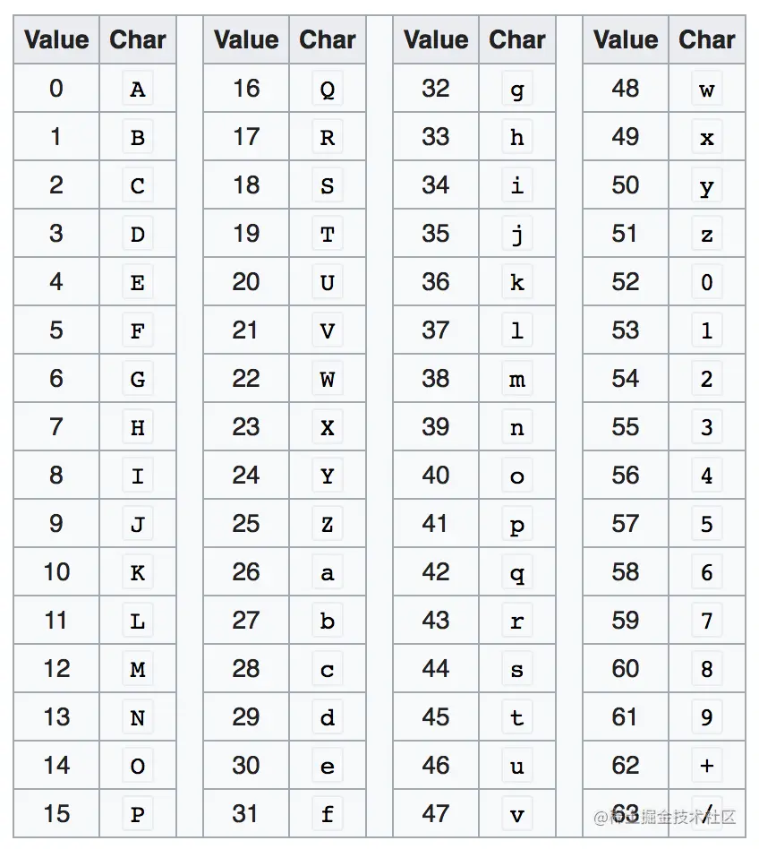 结合上面的 Base64 编码表,上面的结果转成对应的 base64 字符为: