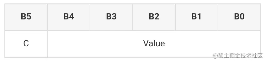 上面的示例中,引入了数字系统外的符号来标识一个数字还未结束。在二进制系统中,我们使用6个比特来记录一个数字(可表示至多64个值),用其中一个字节来标识它是否未结束(正文 C 标识),不需要引入额外的符号,再用一位标识正负(下方 S),剩下还有四位用来表示数值。用这样6个字节组成的一组拼起来就可以表示出我们需要的数字串了。