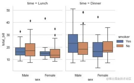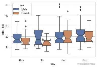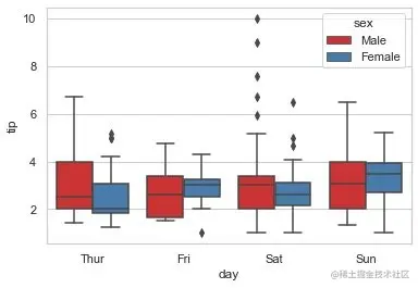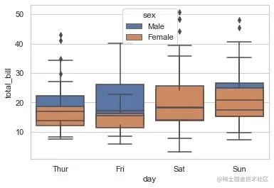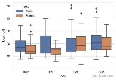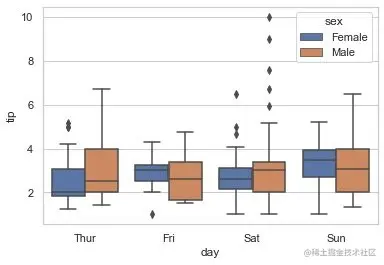 必须和hue一起使用,控制同一个分组下面的箱型图是分开绘制还是重叠在一起