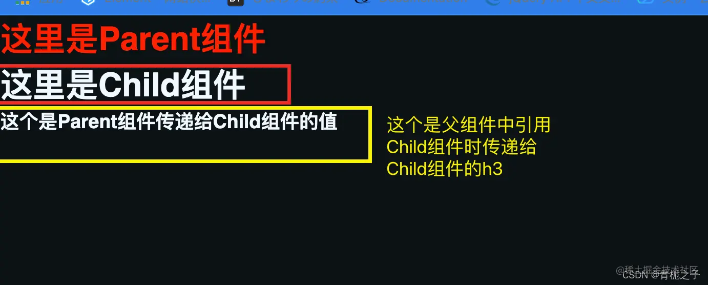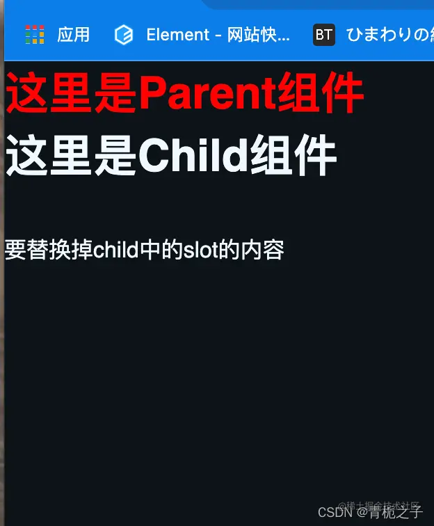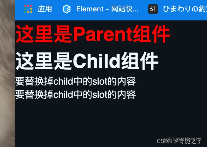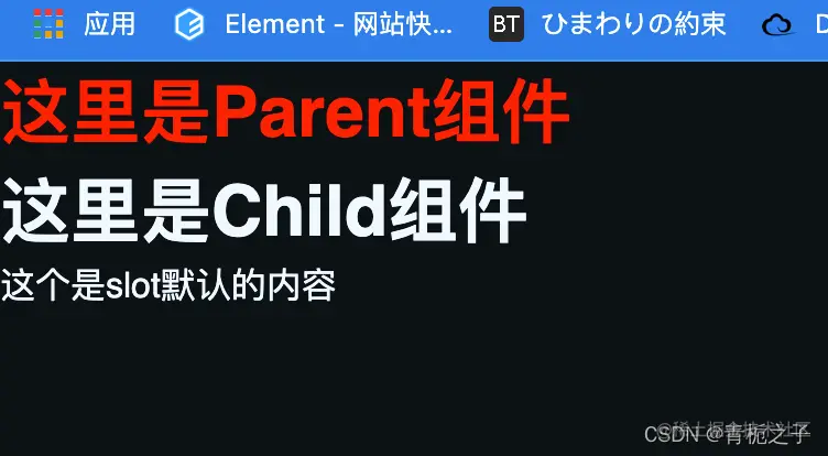 可以看到,在父组件中引用了Child这个组件,在其中写了一个h3标签,这个h3会完全替换Child组件中的,但是不会替换child中的h1标签。甚至另一个组件也可以替换这个slot,具体例子就不举了,十分简单,就是在父组件中引入另外一个组件,然后把这个组件放入到Parent中的Child中就可以了,这样,另外引入的那个组件中的全部内容就会替换Child组件中的slot标签。