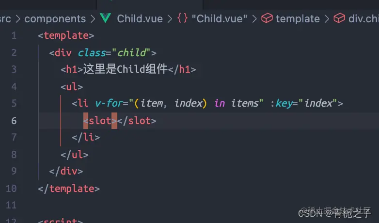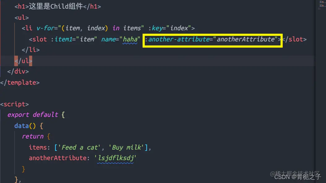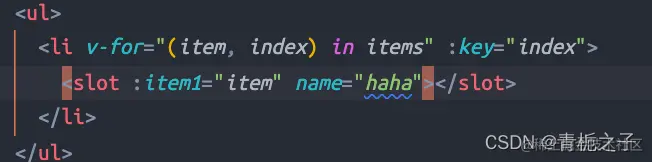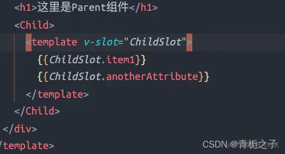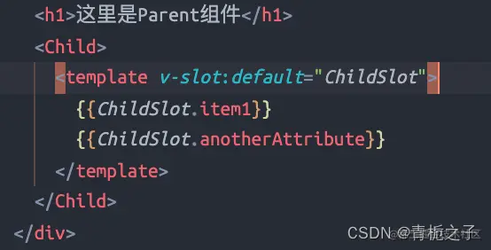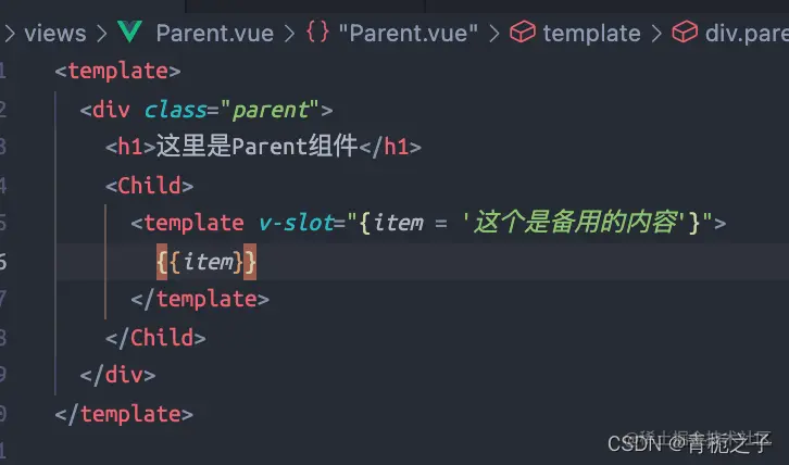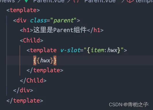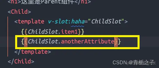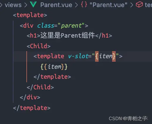 如果直接在Parent.vue组件中使用{{item}}的话是没有效果的,因为item是子组件Child作用域中的值,父组件不能直接引用。但是可以通过上图的:item=“item”的方式来绑定,与此同时,父组件引用的时候要用: “slot的名字.属性”。