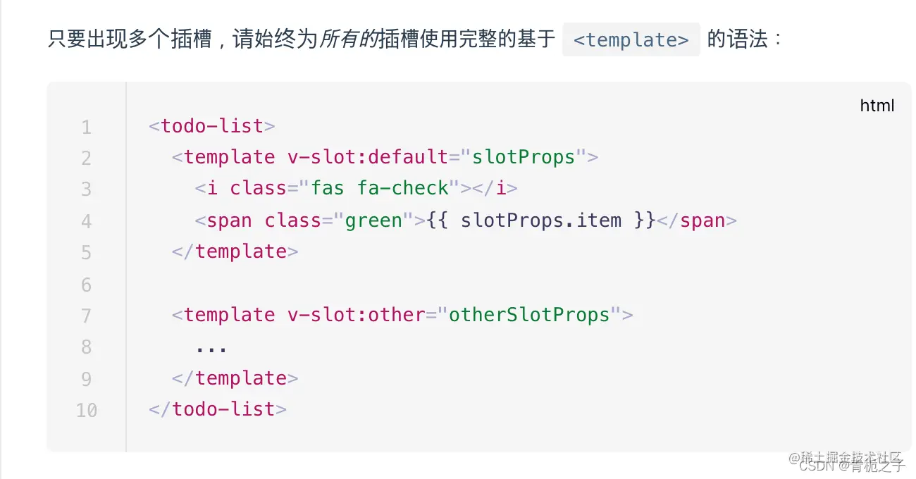 也就是说,子组件中的slot可能有多个,比如一个没有名字的默认slot,那么上面的第一个template的里面的所有内容将会替换这个子组件的默认slot。相同的道理,第二个template里面的内容将会替换名为other的slot