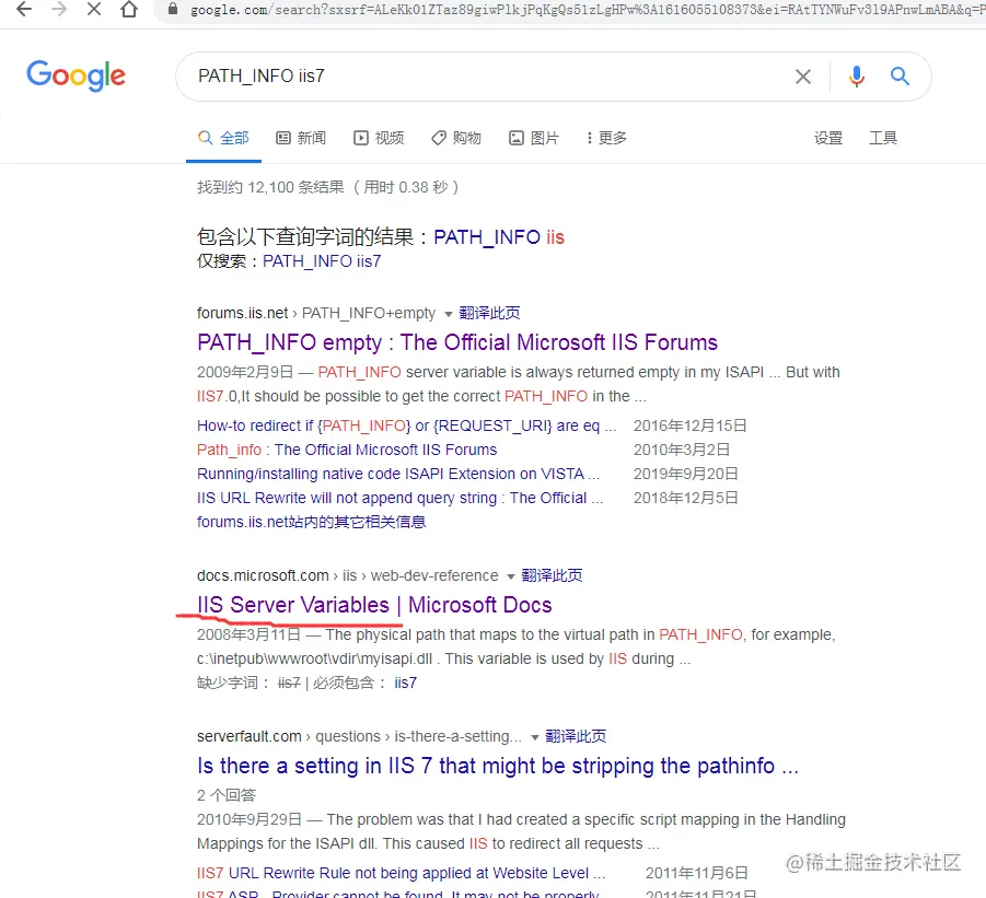 有人会问,那你为什么不一开始在百度搜IIS Server Variables或者搜iis环境变量呢?你这就事后诸葛了,谁能一下子就想到呢?或许我的搜索技能有待提升吧。反正谷歌很懂我,第一页前面就看到了我要的结果。至于百度嘛,不加评价,大家自己看吧。老外的技术论坛有用的信息比较,以后可以多逛逛,还能练练英语水平,不过访问速度好慢啊。