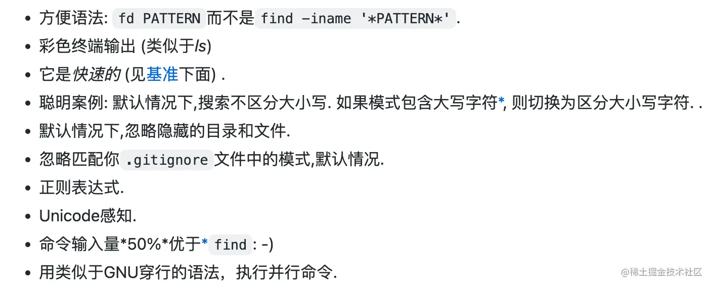 fd 提供了各个操作系统平台的安装方式,再不济可以直接通过源码进行安装(前提是有 Rust 的环境噢)