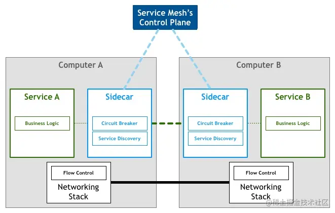 服务网格是处理服务间网络通信的基础设施组件,旨在从平台层面提供可观性、安全以及可靠性特性,以进程外的方式提供原本由部分应用层逻辑承载的基础能力,真正实现与业务逻辑的分离。典型的实现是与应用程序一起部署的可扩展网络代理(通常称为 sidecar 模型),来代理服务间的网络通信,也是服务网格特性的接入点。这些代理就组成了服务网格的数据平面,并由控制平面进行统一的管理。
