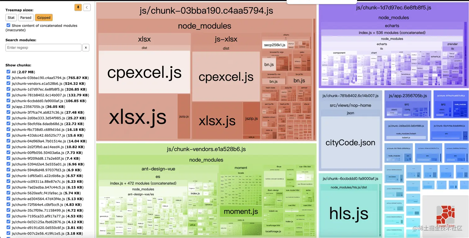 通过上图分析我们可以了解到有大概5个chunk包均大于100KB,你可以单独勾选具体文件通过右侧观察其构成。而其他小chunk(几KB-10几KB)是内部支持dynamic import的页面组件,分成多个chunk以方便路由动态加载。
