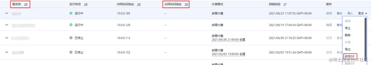 为了获得“公网访问地址”,可单击相应图的最右侧“操作”栏的“更多”中的“绑定EIP”按钮进行绑定。