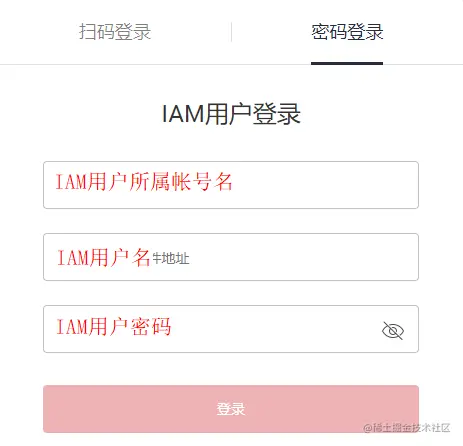如果是 IAM 用户登录的方式,“IAM 用户所属账户名”、“IAM 用户名”、“IAM 用户密码”的对应内容见下图: