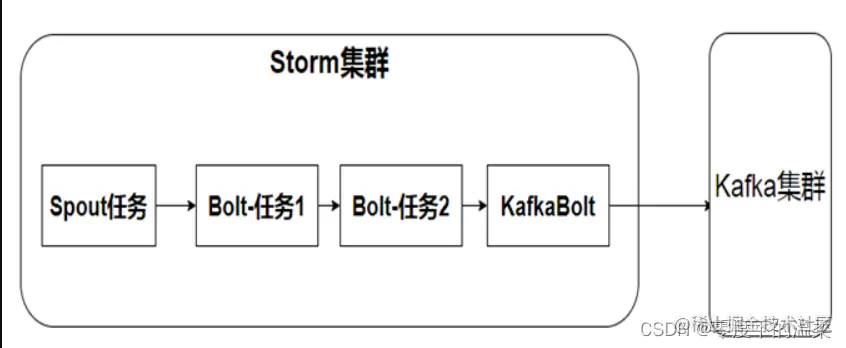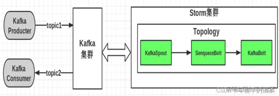在前面的例子中,我们集成了Storm和Kafka。将Kafka作为Storm的Spout,Storm将从Kafka中接收数据,并处理数据。其实还有另一种情况,就是Storm处理完成后,也可以将数据输出到Kafka中,下图描述了这一过程。