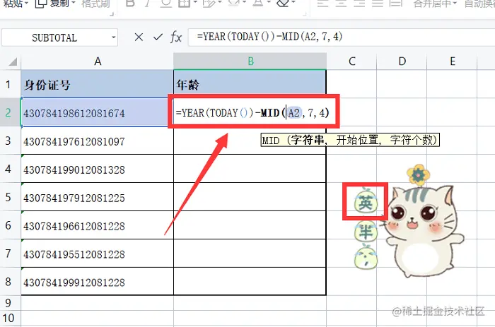 步骤一: 打开需要提取年龄的Excel表格,在身份证号后的空白单元格内输入=YEAR(TODAY())-MID(A2,7,4),输入完毕,按Enter键即可。为什么是输入7,4呢?它的含义是锁定身份证号中的年份,进而计算出年龄。A2是可变化的,点击哪个身份证号就是计算那个年龄。